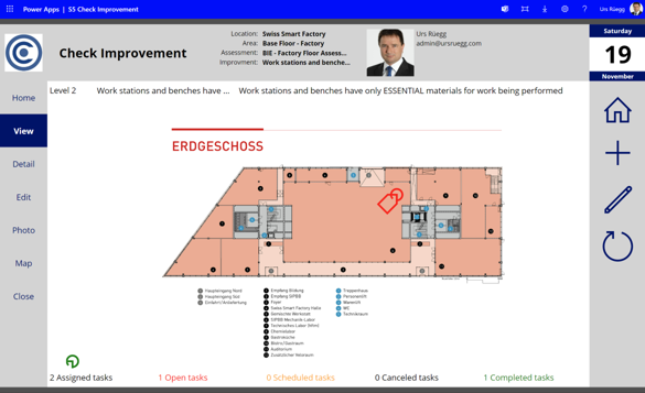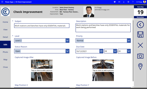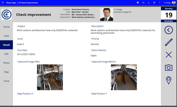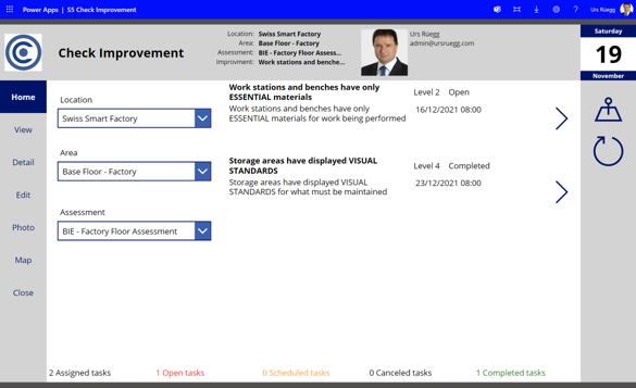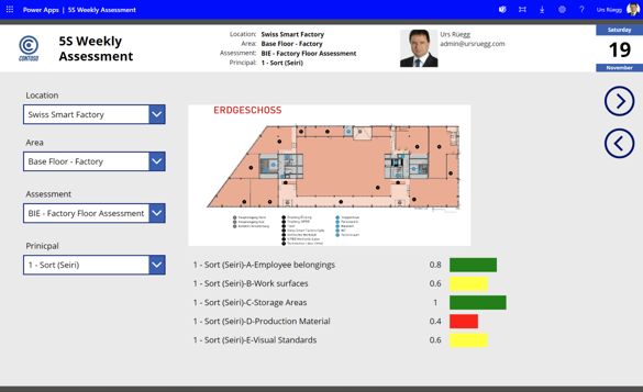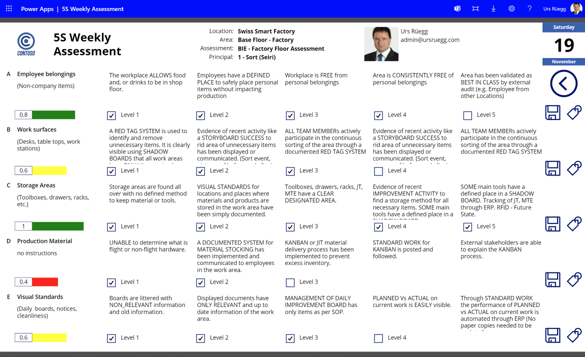 5S Assessment app – Main app for the area leader to perform regular assessment and capture and assign improvements task.