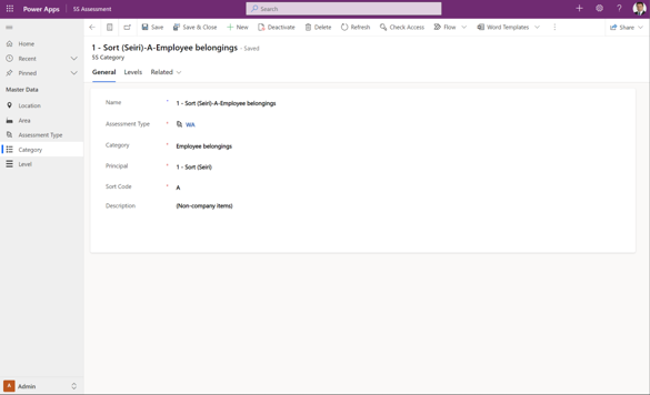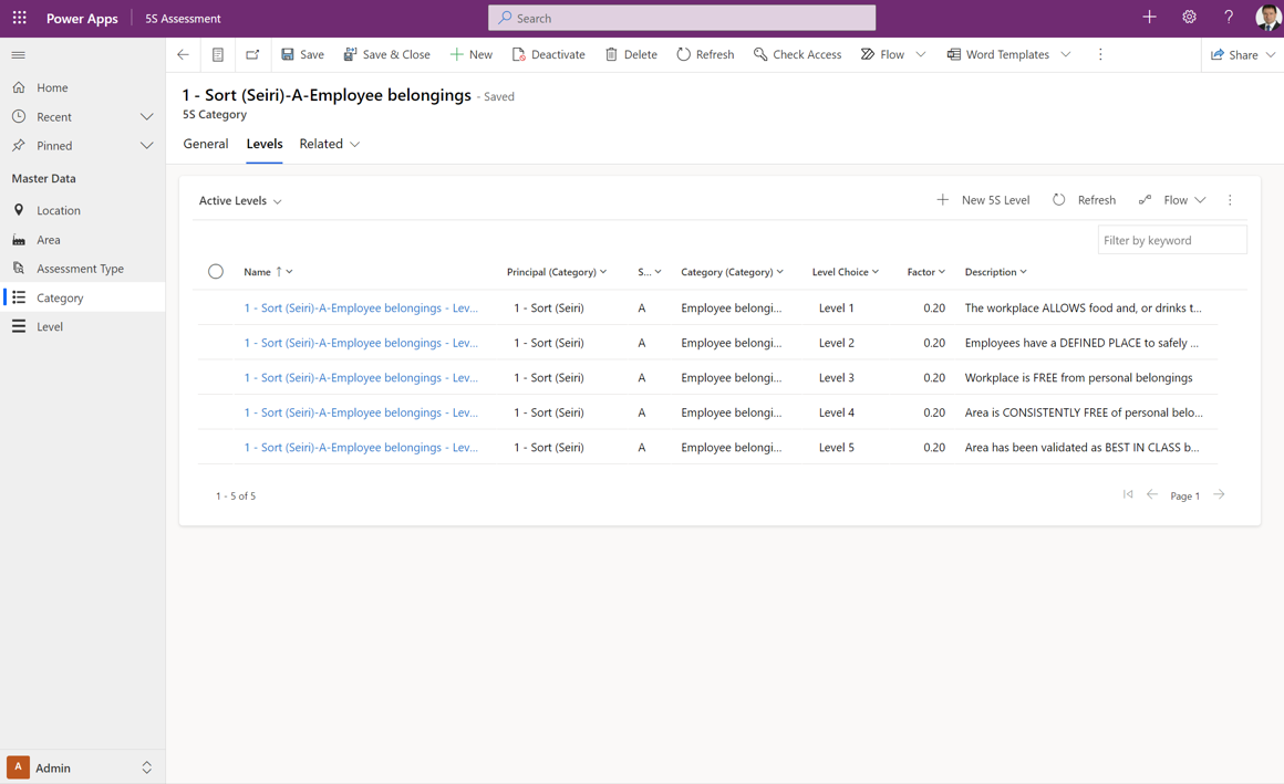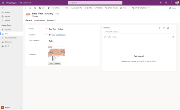 - Master data: Site (Location), Area, Assessment Type, Category and Level