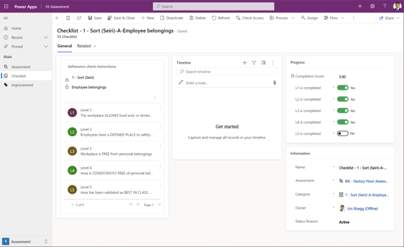 Recently we have had manufacturing customer engaged in a Hackathon with us to implement the 5S Assessment for support lean management objectives. They used Excel based assessment sheets to perform the assessment for each area like factory floor, engineering workspace or warehouse. You can imaging it get quite complex to manage 100+ assessments and improvement activities via excel shared sheets with all key stakeholder owing the assessment for each location and delegating the improvement activities to the area owners. Beside this a key challenges was to own and maintain the 5S assessment toolset by the business owner responsible for the lean management.